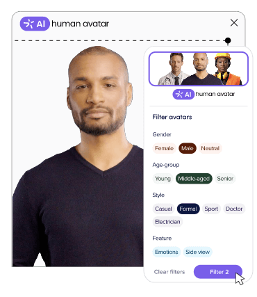 Customize your avatar’s look, outfit, tone of voice, and more. Get a personalized outcome that perfectly aligns with your brand and audience.