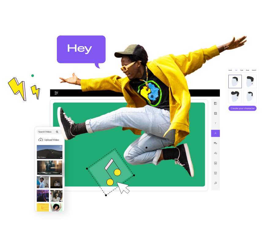 Build characters that resonate with your audience and represent your brand perfectly. Customize hair, clothing and accessories, colors, facial expressions, and animated gestures to create inclusive characters that make your content more relatable and engaging.