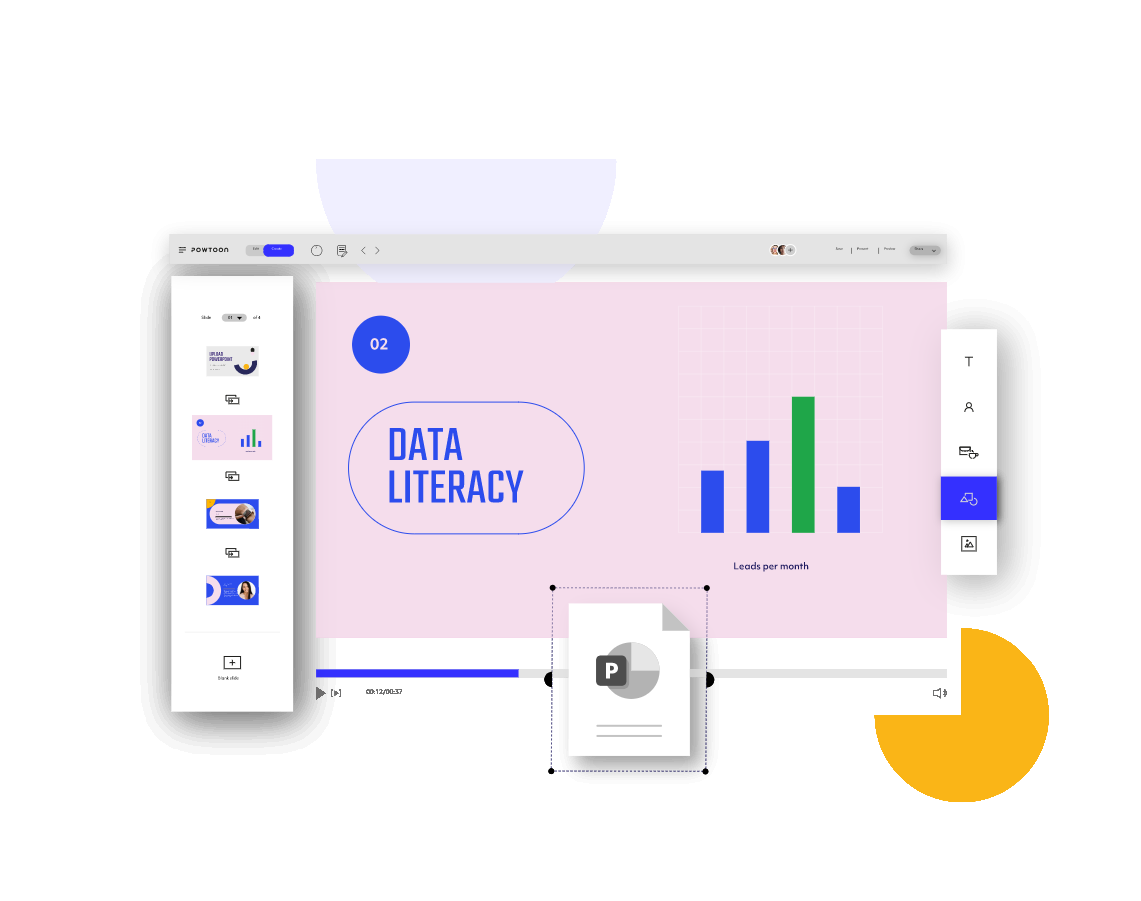Powtoon is a free video presentation maker where you can create video presentations online anytime, anywhere. Choose from thousands of video templates, free stock images and videos, drag and drop animation, characters, voiceover, and music soundtracks – or upload your own – to create your own unique video presentations. Share directly to PowerPoint, YouTube, Facebook, LinkedIn, email & more! Watch your video presentation come to life in seconds.